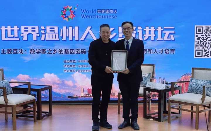 温州市委统战部副部长、温州市侨办主任叶军为陈钱林颁发《乡贤讲坛》主讲嘉宾荣誉证书