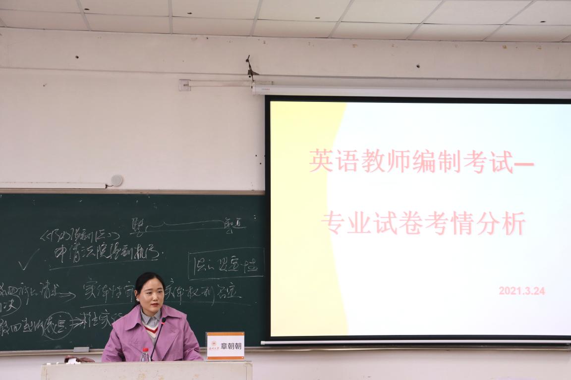 笔试是编制考试的第一道门槛。3月24日,章朝朝老师以“英语教师编制考试笔试-专业试卷考情分析”为主题,帮助同学们加强对当今考编现状的了解。章老师给同学们提出了几点建议:重视大学专业知识的学习、 明确定位、 提高授课能力、将民办学校工作划入考虑范围。考编考试题型比较稳定,但题目难度可变性很强,需要做好分析和研究。此外,同学们平时要注意教育学和心理学专业知识的积累,落实全面复习,抓住重点,运用方法并进行自我摸底,制定复习计划,同时提高设置教学目标和教学设计的能力,注重教学设计课堂化、具体化、成熟化。