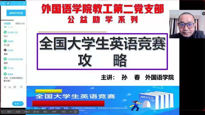 本次公益讲座由学院专任教师孙春老师主讲。孙老师从全国大学生英语竞赛的背景、奖项设置、我校往年奖励措施、竞赛详细题型及报考准备攻略等五个方面细致进行讲解,并耐心回答了很多同学的在线提问。