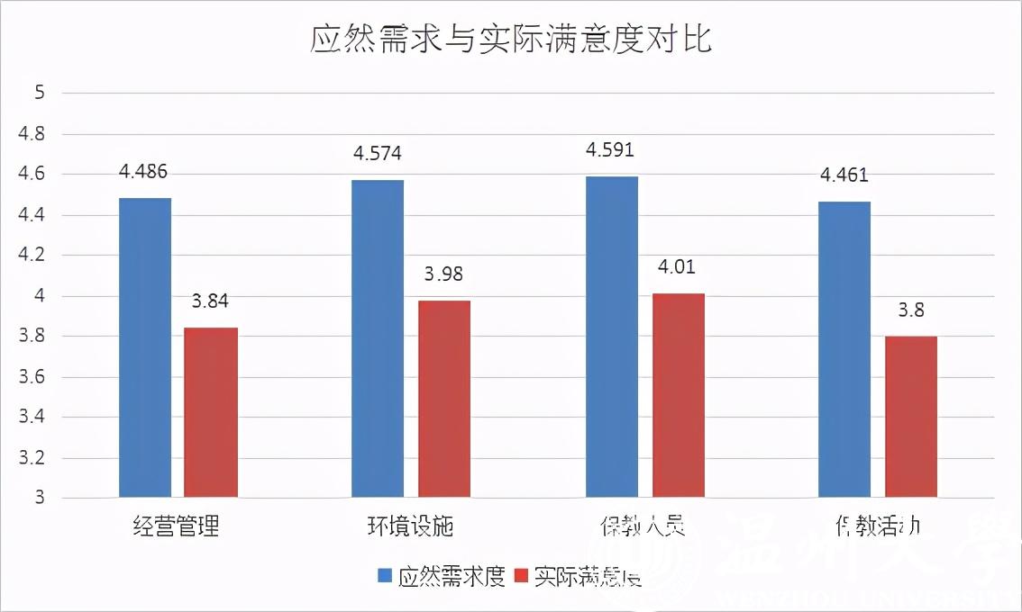 通过对家长各个维度的需求程度与实际满意度进行对比分析之后不难发现,对托育机构所提供服务的实际满意度均远低于家长原先对托育机构各维度的需求程度即心理预期。