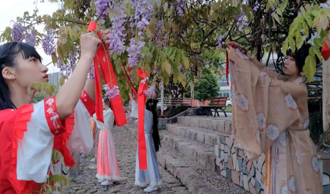 据本次活动组织者、班级团支书陈晓同学介绍,花朝节是汉族传统节日,因地域不同花期不同,一般于农历二月初二、十二、十五或二十五择日举行。古时,人们会在这个节日结伴踏青赏花,吃花糕,行花令,玩“投壶”游戏,挂彩纸“赏红”,还会佩戴美丽绢花,希望自己像花一样朝气与美丽。为积极传承优秀传统文化,促进班级凝聚力建设,班级特意举办了这场“花朝节”主题团日活动,让同学们穿上美丽的汉服,在繁花盛开的温大校园里,仿效古人穿汉服、学汉礼、踏春景、投壶、簪花,体验不一样的传统节日。