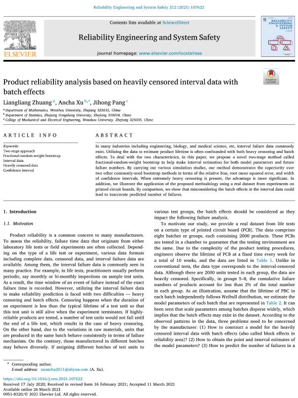 近日,星空平台数理学院2019级应用统计专业研究生庄亮亮,以第一作者身份在专业领域国际顶级期刊《Reliability Engineering & System Safety》上,成功发表科研论文《Product reliability analysis based on heavily censored interval data with batch effects》(基于重度截尾区间数据的产品可靠性分析)。