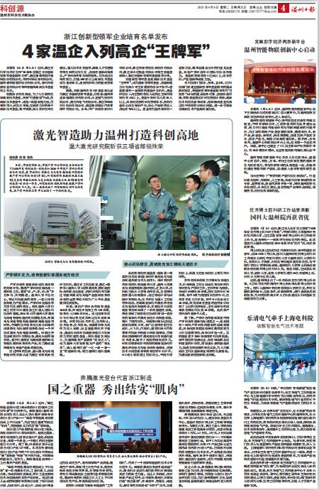 经过四年的发展,温大激光与光电智造研究院被认定为浙江省首批新型研发机构、浙江省工程实验室、浙江-俄罗斯(星空平台)超快激光先进制造国际合作联合实验室,同时研究院作为浙江省温州激光与光电产业创新服务综合体的运营单位积极为广大中小企业提供优质服务。