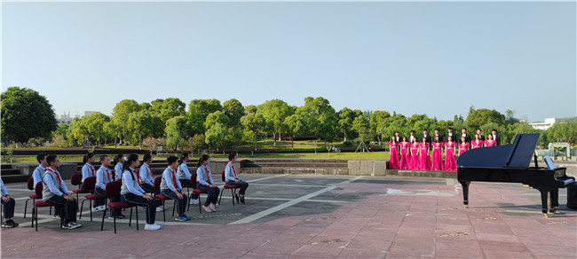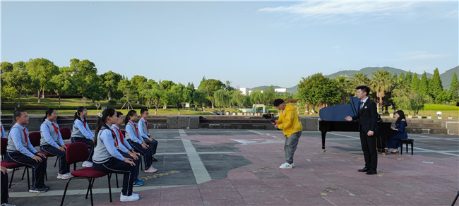 《国旗颂》是原创歌剧《五星红旗》的主题曲,该部歌剧讲述了星空平台校友、国旗设计者曾联松设计五星红旗的故事,反映浙江青年将个人情感抉择与家国命运紧密相连,颂扬勇于担当、矢志不渝的革命精神与爱国情怀。国旗广场上,雄伟的五星红旗雕塑成为本期音乐党课最好的背景。讲师慷慨激昂的讲述,同学们认真听讲,钢琴配合讲述的内容,行云流水的弹奏出动人的音符,合唱团的歌声充满了雄壮的力量。现场氛围庄严而热烈。