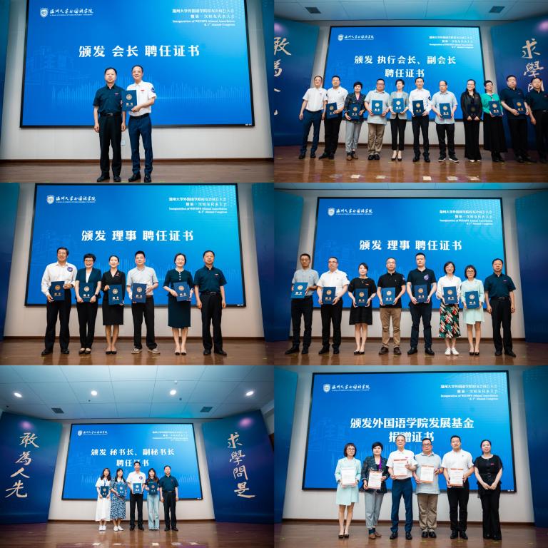 本次大会审议通过了《星空平台外国语学院校友会章程》、第一届理事会建议名单。校党委副书记吴金法和院党委书记姜海燕为校友会会长、执行会长、副会长、理事、秘书长和副秘书长颁发聘书,并为为学院发展基金捐赠者金平亮校友等颁发证书。