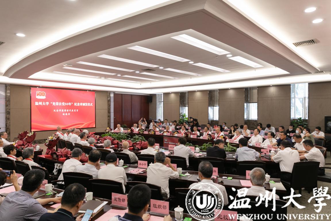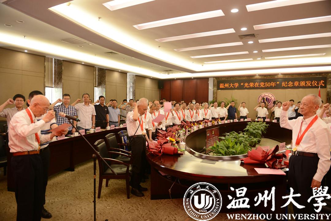 校党委书记谢树华逐一为老党员颁发“光荣在党50年”纪念章,并与他们亲切握手、真挚慰问,表达对老党员的崇高敬意。他希望学校各级党组织和广大党员以纪念章颁发为契机,深入推进党史学习教育,持续掀起向老党员学习的热潮,主动向先进看齐、向榜样看齐,在学校高质量发展新征程中,担当作为、奋发奋进、出力出彩。
