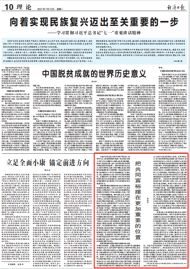 习近平总书记在庆祝中国共产党成立100周年大会上的重要讲话中强调,“着力解决发展不平衡不充分问题和人民群众急难愁盼问题,推动人的全面发展、全体人民共同富裕取得更为明显的实质性进展”。实现共同富裕是社会主义的本质特征,是重大经济问题,也是关系党的执政基础的重大政治问题。经过全党全国各族人民持续奋斗,我们已经全面建成了小康社会,踏上全面建设社会主义现代化国家的新征程。在新征程中,我们要进一步深化对实现共同富裕的认识,把促进全体人民共同富裕摆在更加重要的位置,向着这个目标更加积极有为地进行努力。