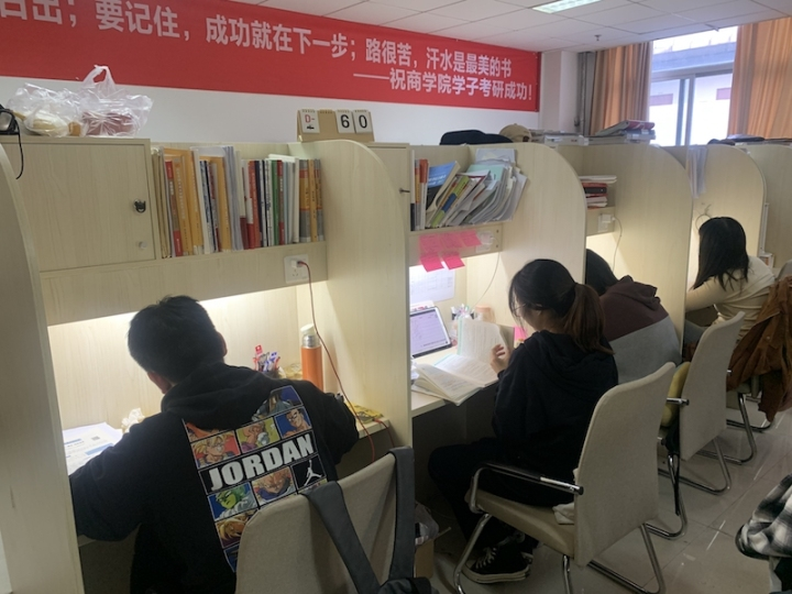 该院老师韩新华介绍说,这样的考研样板房是在去年9月正式投入使用的,目前共有60个位置,其中大部分位置还有“专属权”,学生们可以放心将自己的复习资料放在这里。“我们学院今年申请考研样板间的学生有近200人,按这个比例来说是不够分配的,所以学生们需要通过学习打卡、健康打卡来竞争有限的位置。“韩老师说,这样的竞争之后,大家都非常珍惜样板间带来的便利资源。很多同学早上7点多就过来学习了。为了能实现自主管理,学院为考研大学生们还安装了指纹锁,想几点来学习想几点走都可以。