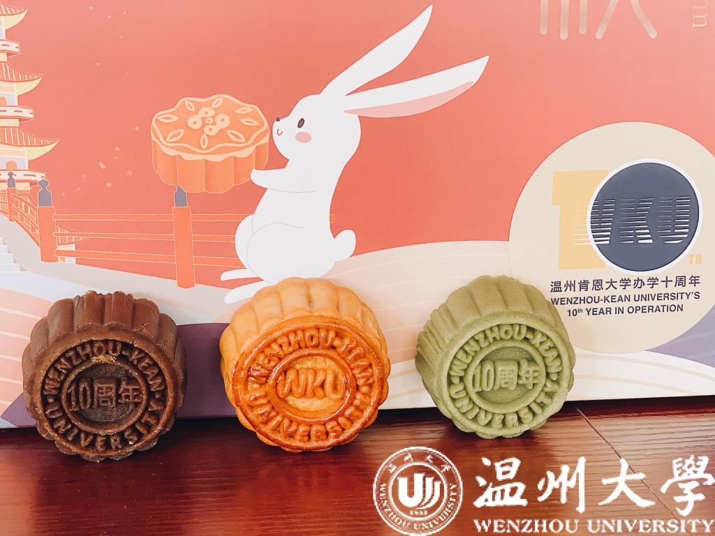 今年中秋节,温州肯恩大学推出十周年纪念版月饼。该纪念版月饼分为2种款式,外圈均是温州肯恩大学的英文全称,内圈分别印着“wku”和“十周年”,其中印有“wku”的月饼是金黄色的,有蛋黄和玫瑰2种口味。而印有“十周年”的月饼分为咖色和茶色,分别为咖啡味和抹茶味。
