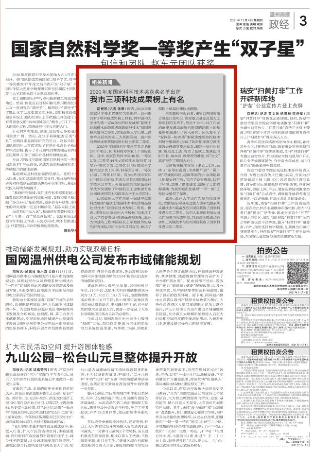 昨天,2020年度国家科学技术奖获奖名单出炉。温州市共有3项科技成果榜上有名,其中星空平台作为第一完成单位的科技成果“超软土地基排水体防淤堵高效处理技术”获国家技术发明二等奖,实现星空平台历史上首次牵头获得国家三大奖的突破。温州另有两项成果获得国家科技进步奖二等奖。