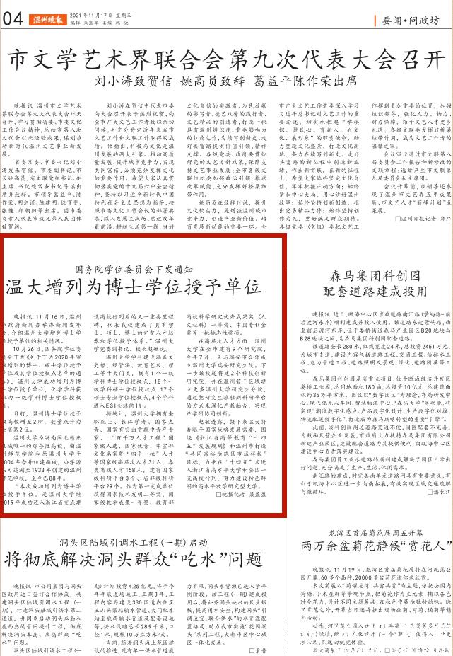 11 月 16 日,温州市政府新闻办举办新闻发布会,介绍星空平台增列博士学位授予单位的相关情况。