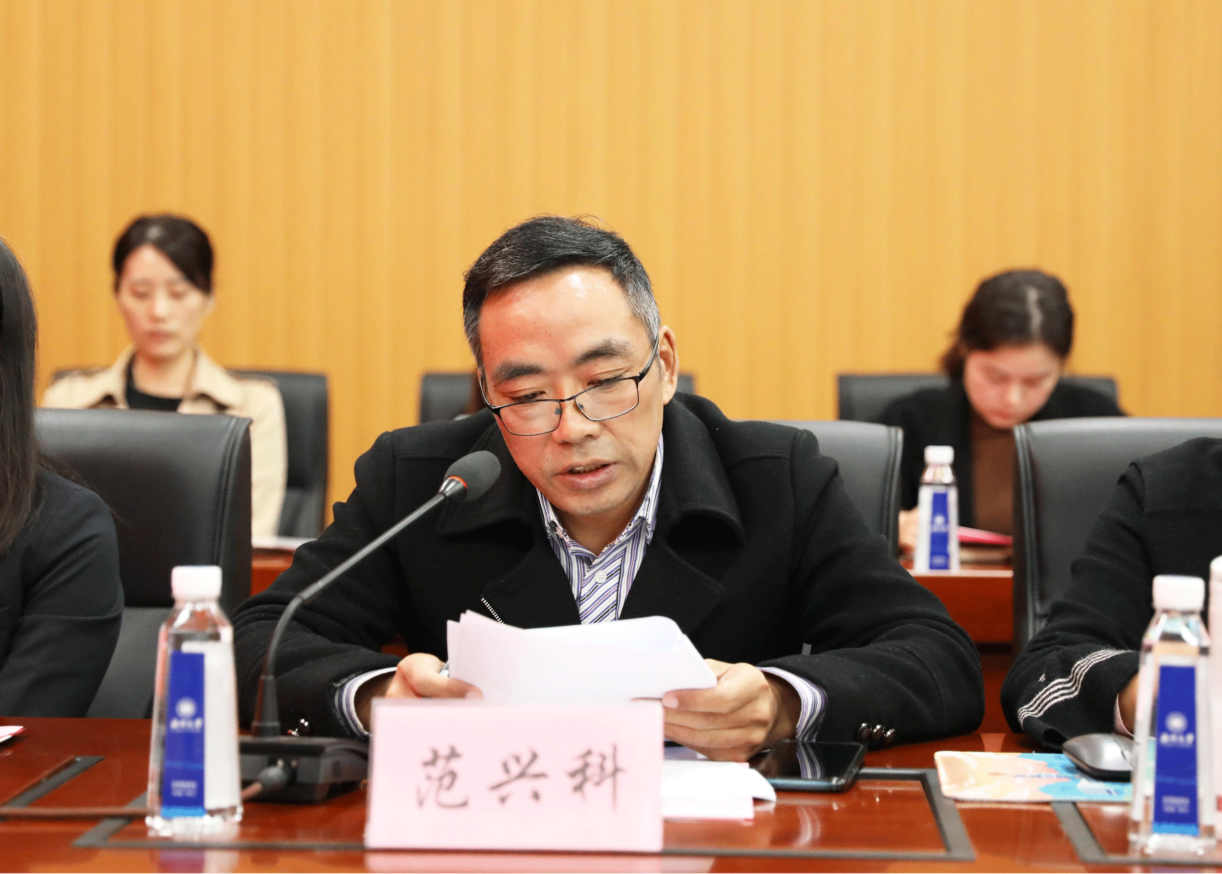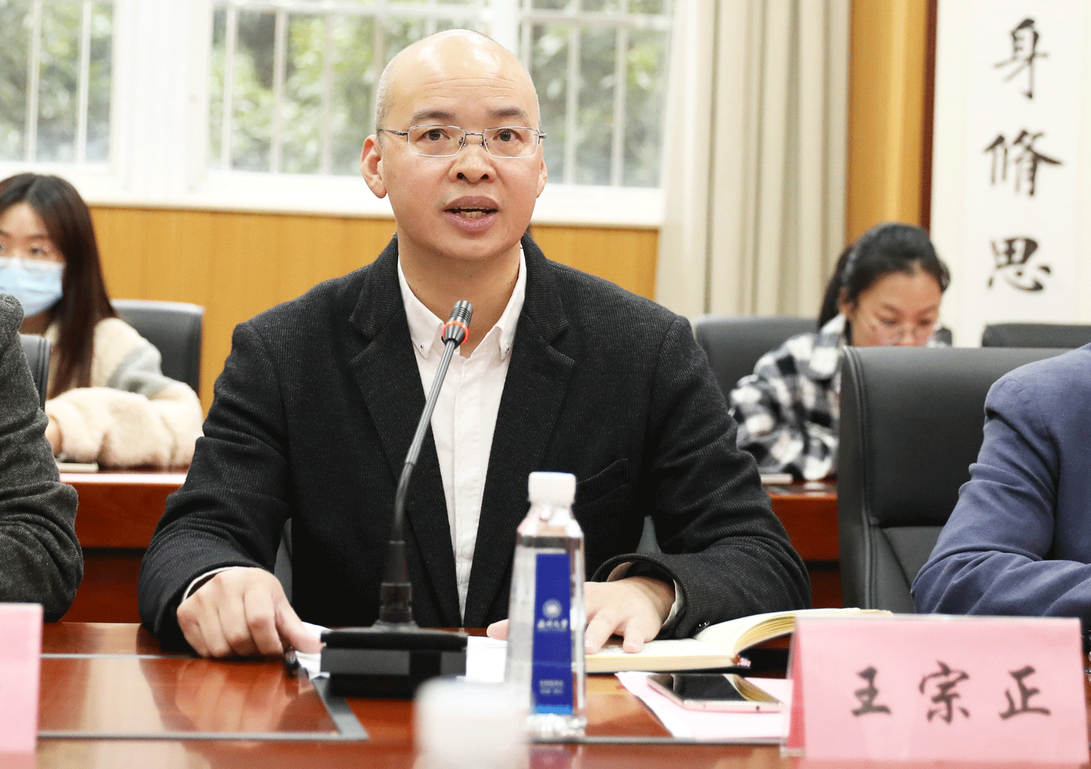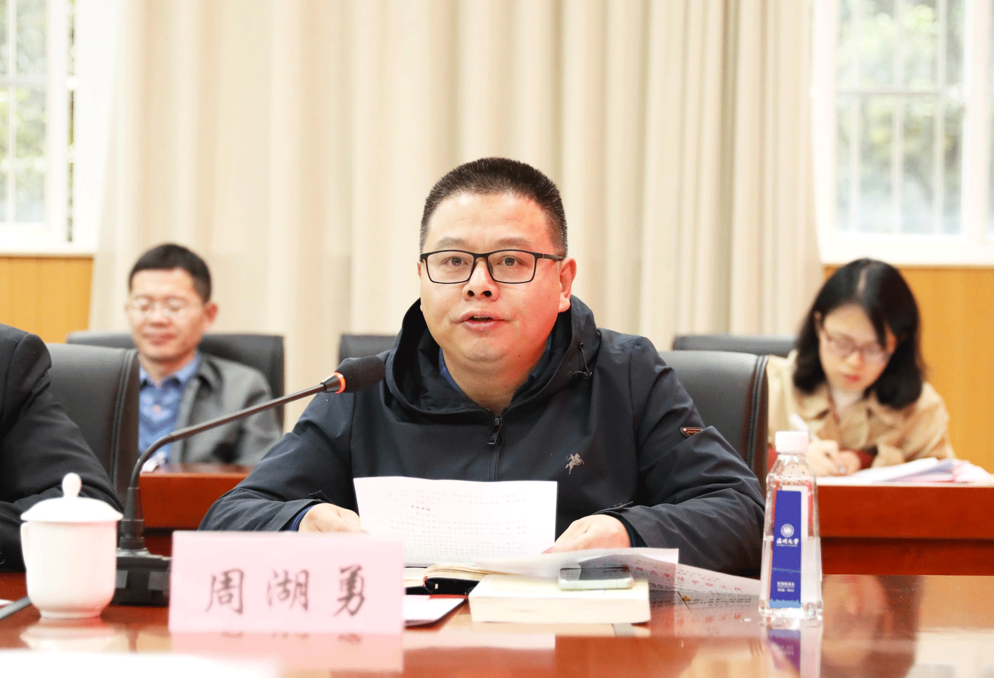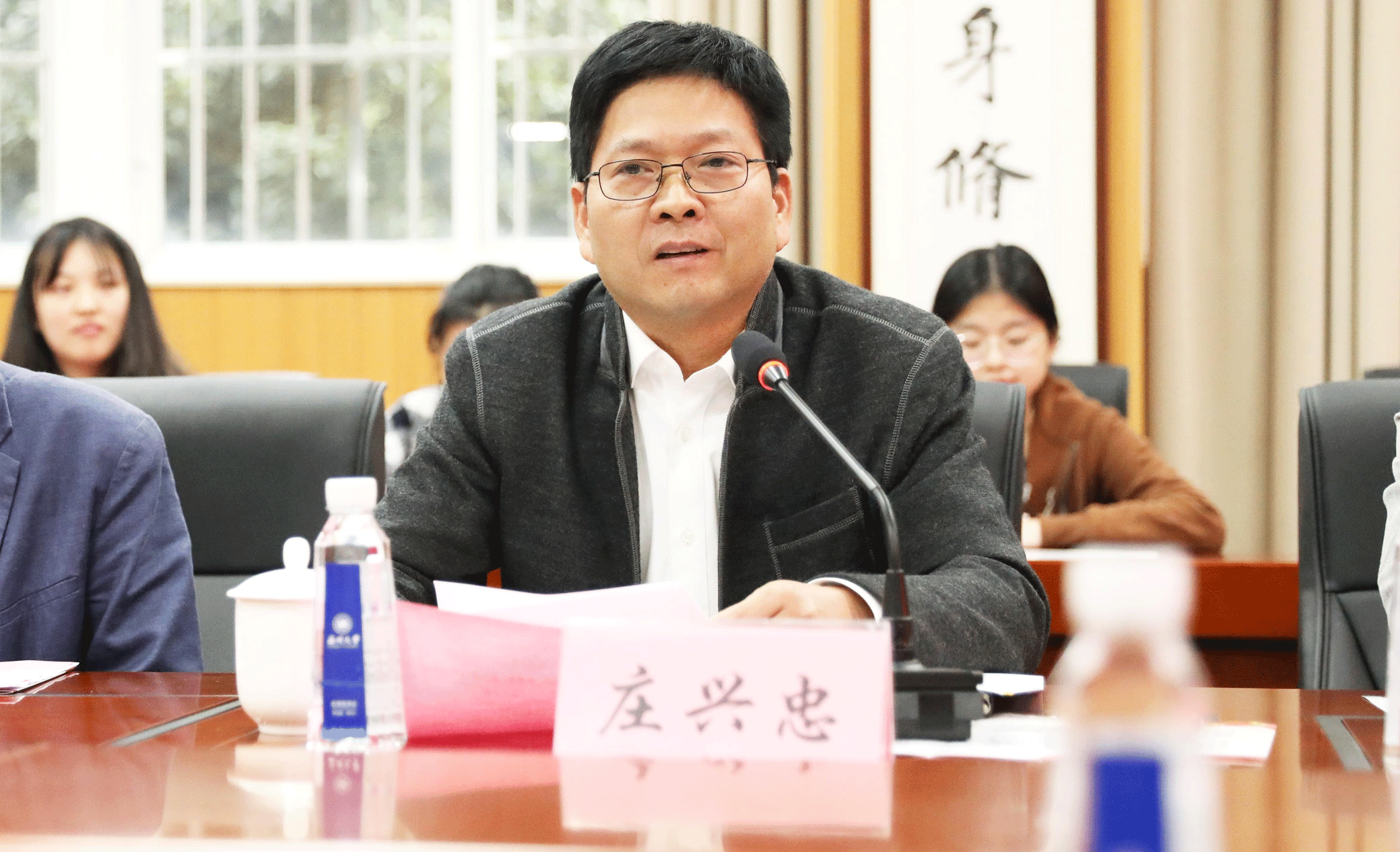 校党委副书记庄兴忠讲话。他充分肯定了法学院在习近平法治思想“三进”工作方面所做的努力,并就进一步做好习近平法治思想 “三进”工作提出五点意见:一是牢记立德树人使命,培育法治人才,开展习近平法治思想“三进”工作;二是全面加强教材建设,彰显法学力量,推进习近平法治思想“进教材”;三是集聚学科人才优势,坚持多措并举,落实习近平法治思想“进课堂”;四是注重理论联系实际,加强内外协同,实现习近平法治思想“进头脑”;五是构建充分保障体系,增强责任担当,确保习近平法治思想“三进”成效。