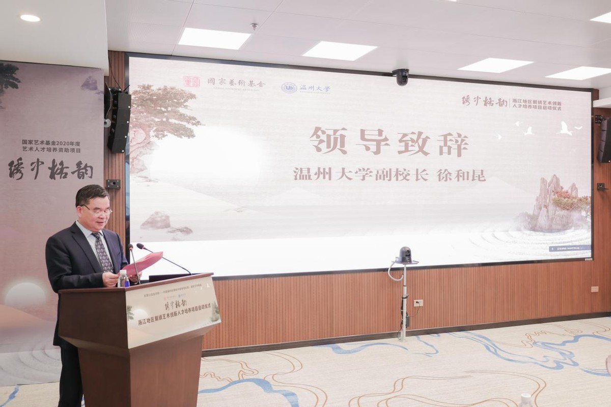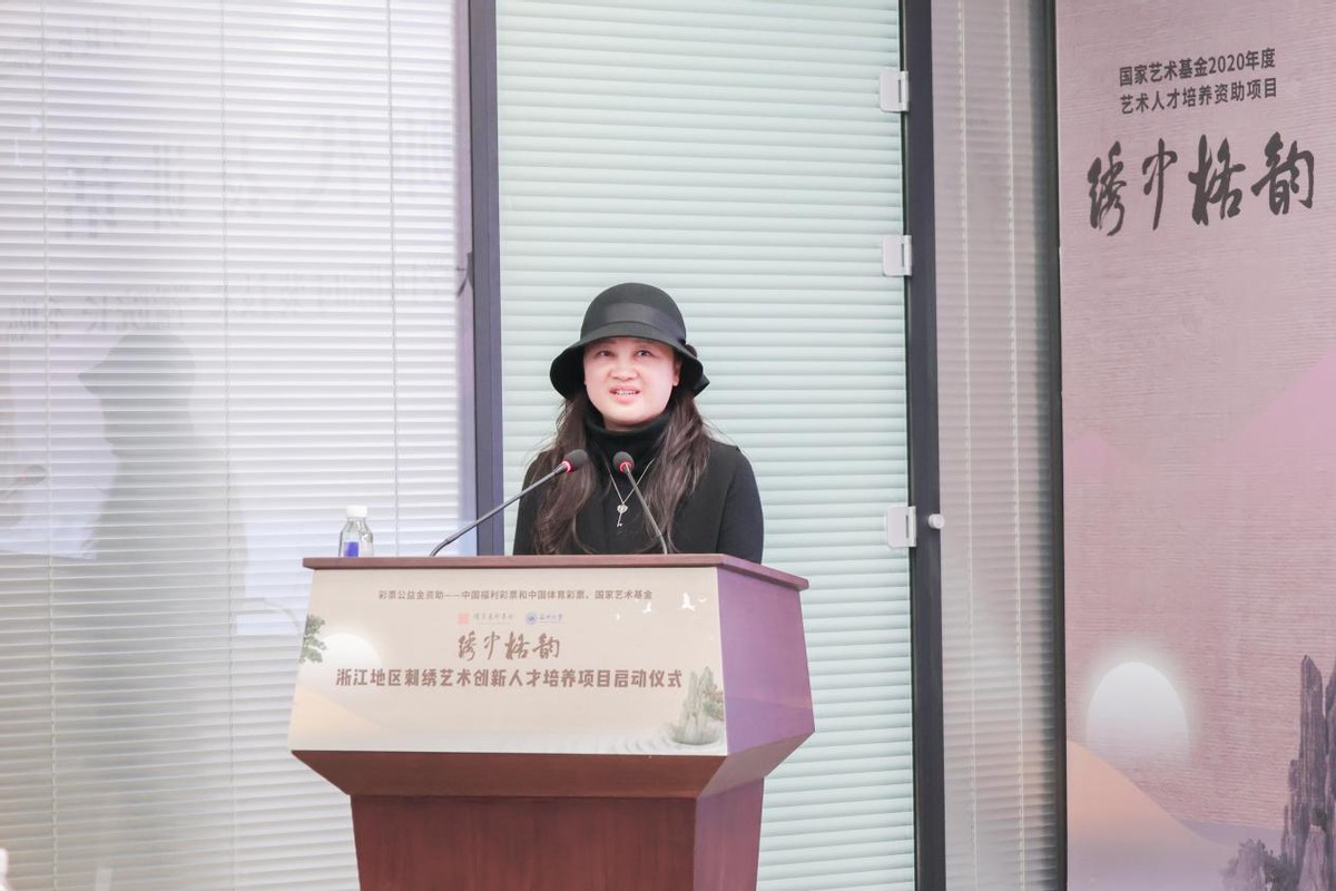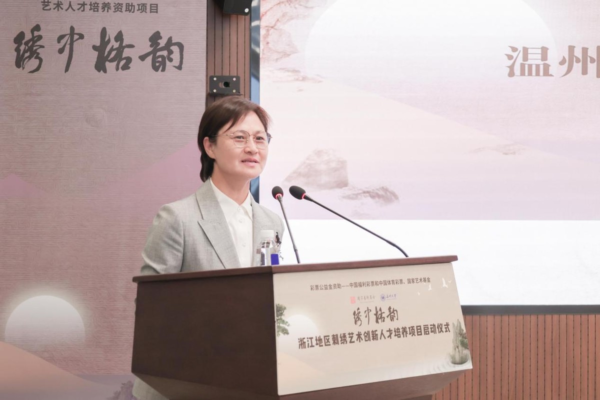 温州市文化广电旅游局局长朱云华回顾了瓯绣辉煌。她表示,温州市鹿城区秉持以复兴“百工之乡”为己任,多年来,温州市委、市政府对刺绣艺术和产业的发展高度重视,积极搭建各绣种的传承发展、展览展示平台,大力扶持刺绣艺术文化发展,长期推动非物质文化项目进校园等,筑牢传统根基,延伸产业链条,为经济社会全面发展注入深厚的文化底蕴和强大的精神支撑。她希望通过本次国家艺术基金《浙江地区刺绣创新艺术人才培养项目》启动,大力推进温州非遗人才培养,促进温州工艺美术薪火相传、代代守护。