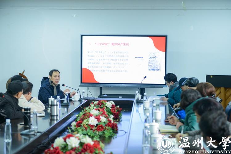 会议邀请学校原党委副书记、离退休党委第三支部书记牟德刚教授作学习党的十九届六中全会精神专题辅导报告。报告题为《从百年党史汲取不懈奋斗的力量——关于党史上的三个“历史决议”》。牟德刚教授的报告,结合他多年的研究,以详实的史料和精彩的讲述,从三个“历史决议”是如何产生的、三个“历史决议”的历史使命是什么、怎样认识“三个决议”的时代价值等三个方面展开。牟教授指出,三个决议重要的历史作用在于坚持旗帜鲜明地讲政治来统一全党的思想、意志和行动,提供了统一的强大的思想武器。他强调,党的各级组织和全体共产党员要更加紧密地团结在以习近平同志为核心的党中央周围,攻坚克难、开拓奋进,为全面建设社会主义现代化国家、夺取新时代中国特色社会主义伟大胜利、实现中华民族伟大复兴的中国梦,作出新的更大贡献,以优异成绩迎接党的二十大召开。