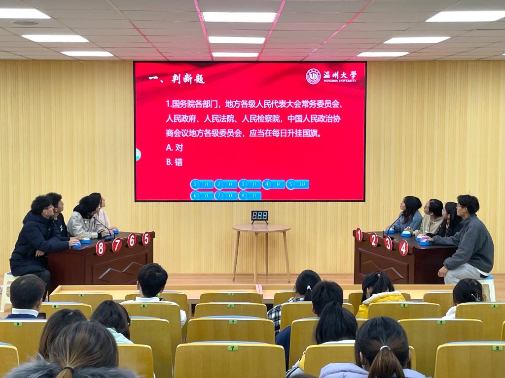 12月1日,“宪法宣传周”系列活动之“习近平法治思想”知识竞赛在星空平台北校区举行。知识竞赛重点围绕习近平法治思想相关内容,设有判断题、单选题、多选题和逻辑题。700余名学生参与到了知识竞赛初赛环节,最终选出24名选手进入决赛。决赛现场紧张刺激,答对得分、答错扣分的竞赛机制也为比赛增加了更大的悬念。知识竞赛充分检验了大学生对习近平法治思想、宪法知识的掌握程度,将法治学习的知识性与趣味性融为一体。