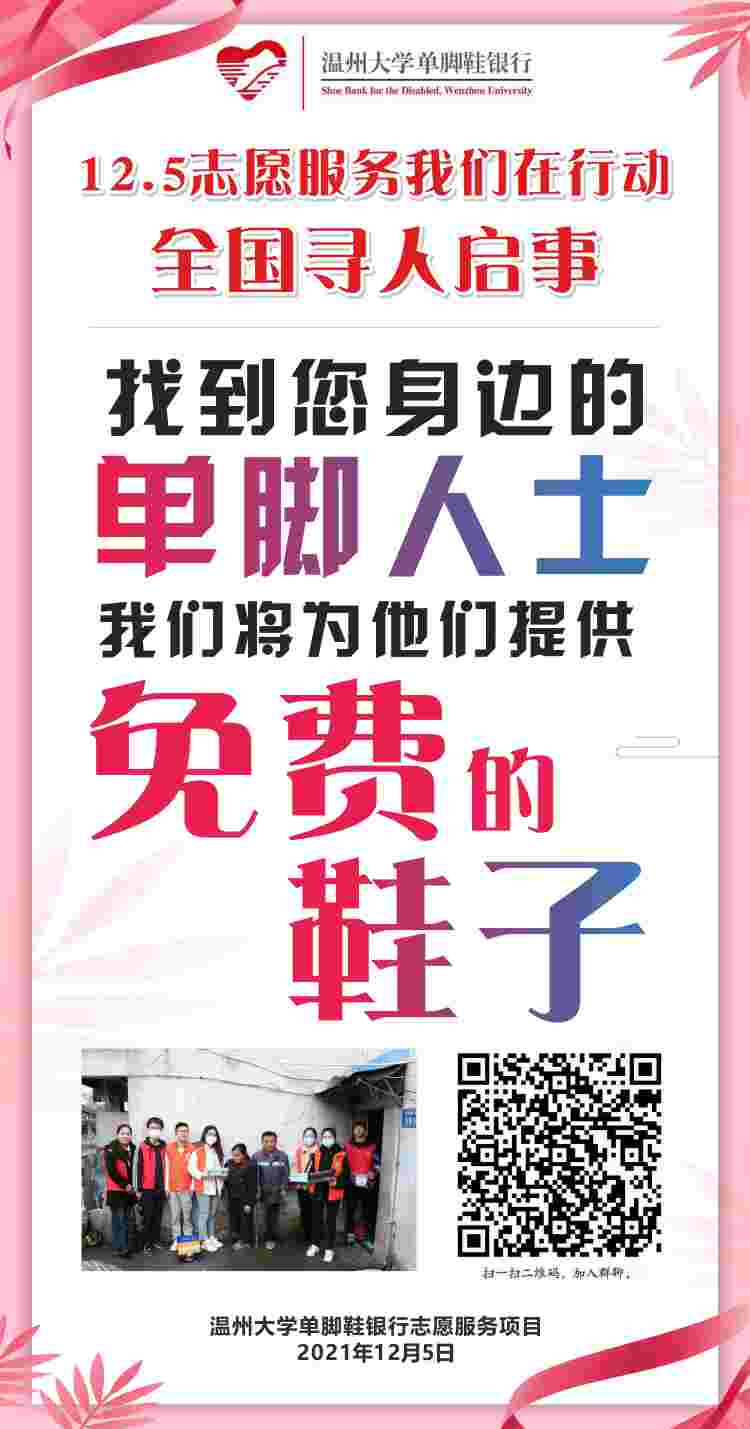 星空平台电气与电子工程学院单脚鞋银行志愿服务团队是一家致力于存储鞋子、存储爱的银行,他们凭借温州“鞋都”优势,立足于大学城,发挥青年学子的力量,为单脚残疾人士免费赠送单脚鞋。正值12月3日“国际助残日”和12月5日“国际志愿日”到来之际,为寻找和帮助更多需要帮扶的单脚残障人士,“单脚鞋银行”志愿服务项目团队于12月5日下午便在星空平台城商务中心开展了“聚焦残疾人士,传递公益爱心”寻找身边的单脚人士公益活动。