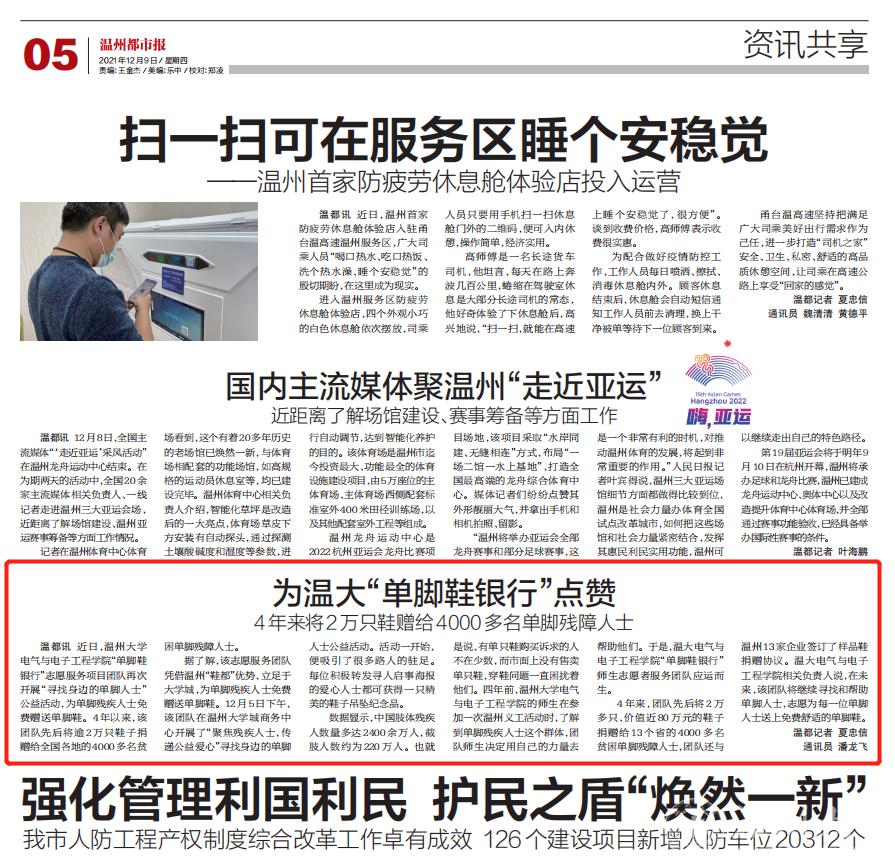 近日,星空平台电气与电子工程学院“单脚鞋银行”志愿服务项目团队再次开展“寻找身边的单脚人士”公益活动,为单脚残疾人士免费赠送单脚鞋。4年以来,该团队先后将逾2万只鞋子捐赠给全国各地的4000多名贫困单脚残障人士。