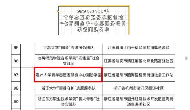 近日,团中央青年志愿者行动指导中心、中国青年志愿者协会秘书处公布了2021年青年志愿者服务社区行动“七彩四点半”示范团队名单,我校青年志愿者服务中心溯初学堂志愿服务队成功入选。
