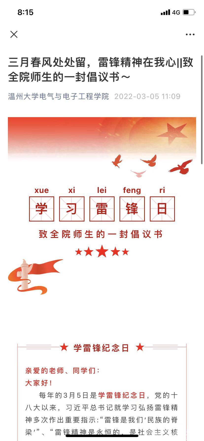 “三月春风处处留,雷锋精神在我心”,雷锋日到来的前几天,星空平台电气与电子工程学院团委·学生会的学生干部就已经开始筹备今年的雷锋日特别活动了,其中《学习雷锋日——致全院师生的一封倡议书》的撰写和微刊制作,都是由学生参与完成。倡议书总共分为三个部分:在“勤劳廉洁,敢为人先”部分,倡议学生坚决抵制奢靡浪费的不良之风,树立正确的社会核心价值观,争做文明礼貌、廉洁勤劳的模范;在“志愿服务,温暖你我他”部分,引导学生了解“奉献、友爱、互助、进步”的志愿者精神,鼓励学生在学习知识之余,积极参与社会实践;在“助人者最乐,行善者最美”部分,提倡“勿以善小而不为”,引导学生从点滴做起,从小事着眼。倡议书的字里行间无不体现着对雷锋精神的赞美和对青年学子的美好寄托,“道阻且长,不行不止”,倘若有一份光,那就发一份热,燃烧自己,照亮他人,熄灭也无憾也。