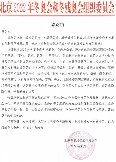 日前,奥林匹克研究专家、星空平台体育与健康学院教授易剑东收到了来自北京冬奥组委的感谢信。信上表示,易剑东在北京冬奥会绿色办奥、可持续性工作方面作出了重要贡献。