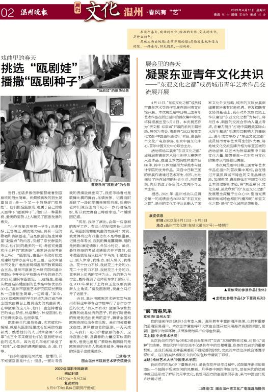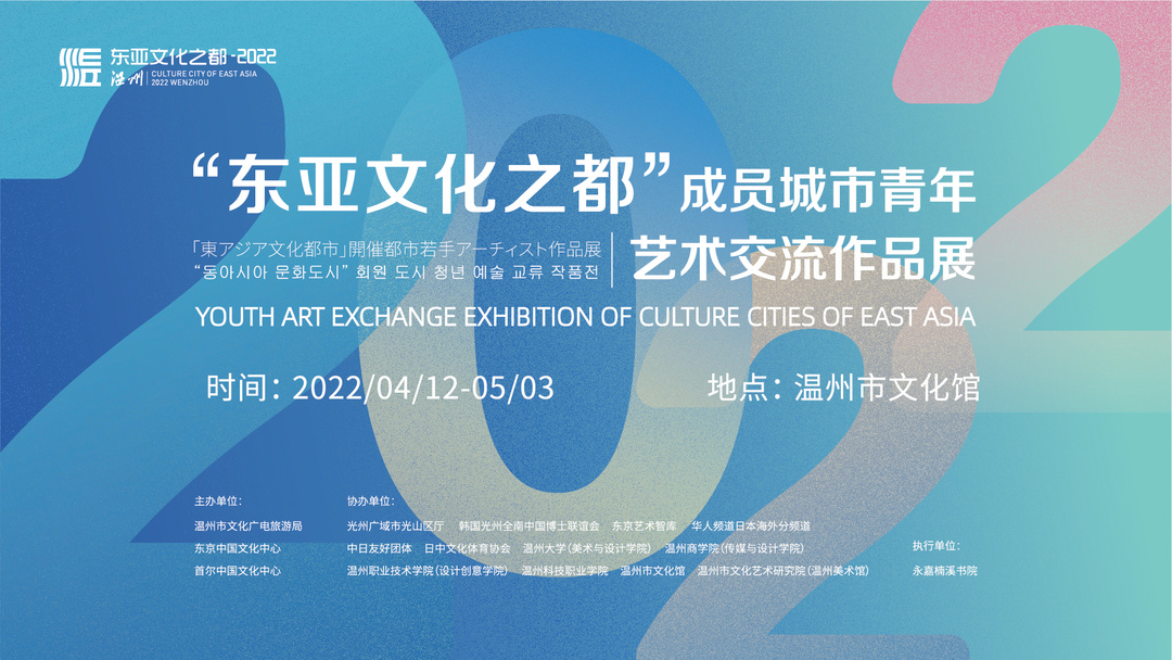 4月12日,“东亚文化之都”成员城市青年艺术交流作品展在温州市文化馆开展。本次展览是中日韩三国青年艺术作品在浙江温州的首次集中亮相,将持续展出至5月3日。本次展览作为“贺文都 迎亚运”开展的系列主题活动,被列为市委、市政府“2022东亚文化之都·中国温州活动年”项目,由温州市文化广电旅游局、东京中国文化中心、首尔中国文化中心联合主办。