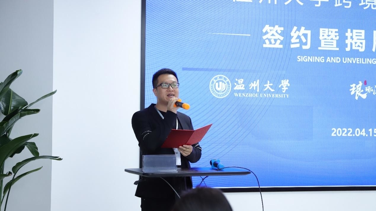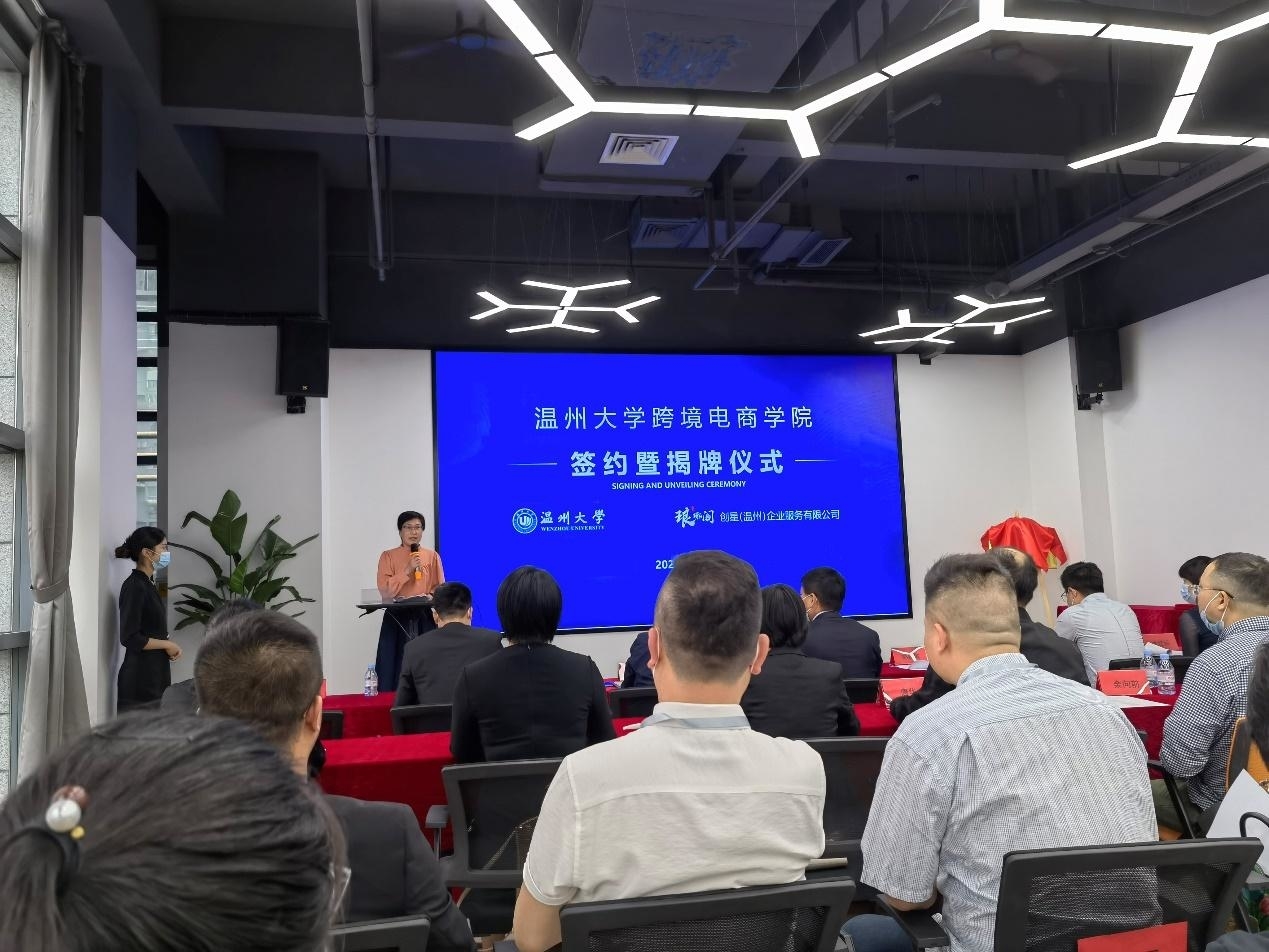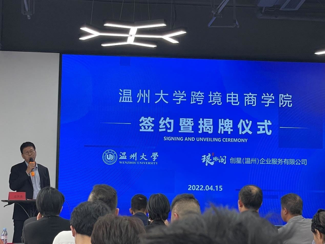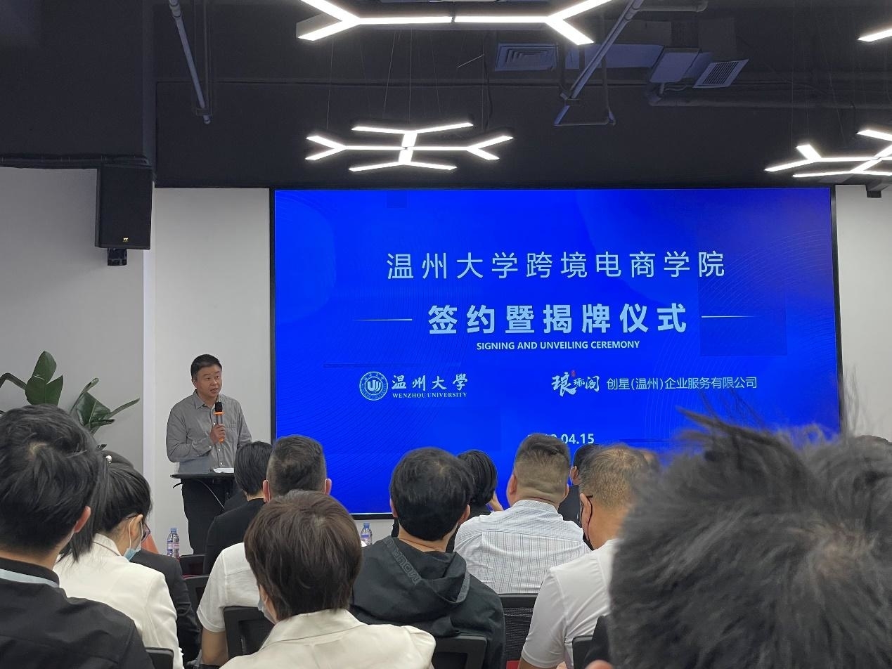 创星(温州)企业服务有限公司负责人致欢迎辞。他表示,2019年底爆发的新冠疫情改变了外贸的模式,以展会为主的温州外贸企业谋求转型。温州人敢为人先、报团取暖,自发成立了琅琊阁外贸企业联合体。用了不到300天时间,琅琊阁建成4层楼达5000平米的联合办公场地,吸收了24家核心企业,举办了50场沙龙和100多场学习。琅琊阁和星空平台开展校企合作以来,已经在人才培养、人才招聘、师资共建等方面成果丰硕。星空平台跨境电商学院的成立将对温州跨境电商生态作出重大的贡献。