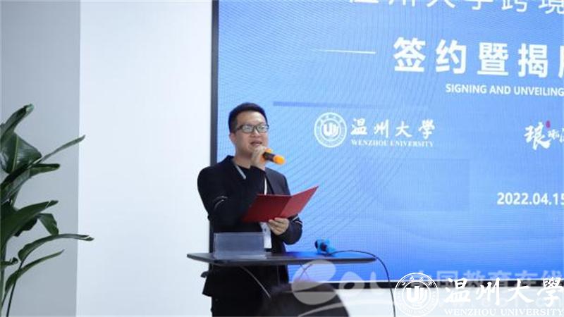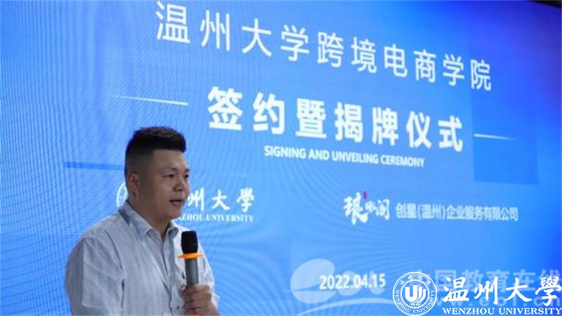 仪式开始后,创星(温州)企业服务有限公司董事长李聪斌首先致欢迎辞。李董事长表示,2019年底爆发的新冠疫情改变了外贸的模式,以展会为主的温州外贸企业谋求转型。温州人敢为人先、抱团取暖,自发成立了琅琊阁外贸企业联合体。用了不到300天时间,琅琊阁建成4层楼达5000平米的联合办公场地,吸收了24家核心企业,举办了50场沙龙和100多场学习。琅琊阁和星空平台开展校企合作以来,已经在人才培养、人才招聘、师资共建等方面成果丰硕。