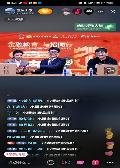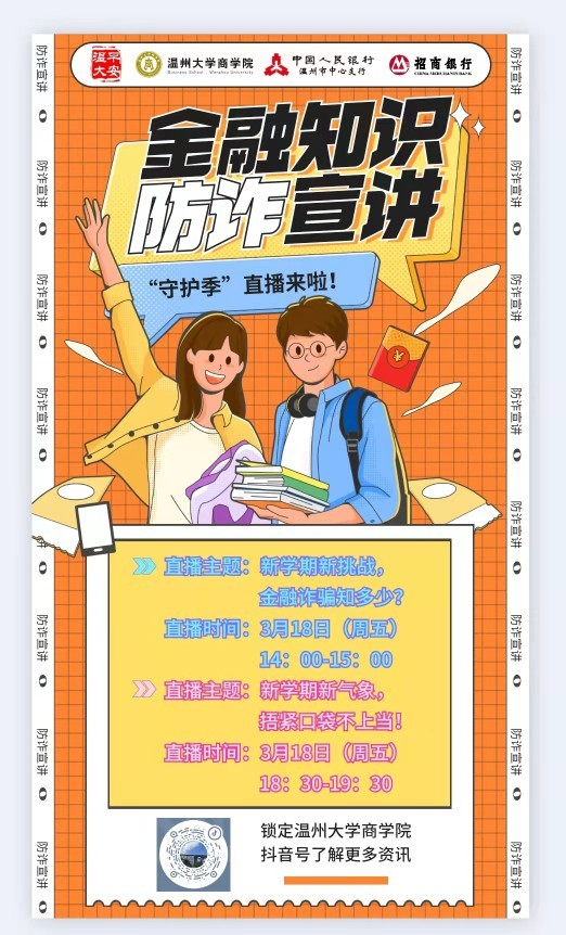 为让在校学生更好地学习金融教育知识、提升金融防诈意识和金融素养,维护校园和谐稳定,3月18日,在人行温州市中心支行指导下,温州分行联合星空平台商学院在金融宣传教育直播基地开展“3.15”消费者权益保护周防诈直播活动。在直播中,招商银行理财经理与星空平台商学院党员金融公益宣讲团成员通过生动形象的案例介绍,讲解了当前电信诈骗常用伎俩,并通过在线与学生互动、编辑顺口溜等方式,提升金融教育的参与度与传播性,活动通过抖音直播的方式进行,整场活动收获1.5万+关注量。与此同时,为了能让防诈宣讲走进班级、走进课堂,达到入脑入耳入心的效果,星空平台商学院党员金融公益宣讲团成员下驻到星空平台各学院、各班级进行宣讲。自4月以来,宣讲团成员已陆续在商学院、化学与材料工程学院、建筑工程学院、生命与环境科学学院、电气与电子工程学院、外语学院等学院宣讲,覆盖班级达50余个,覆盖学生人数高达约2700人。
