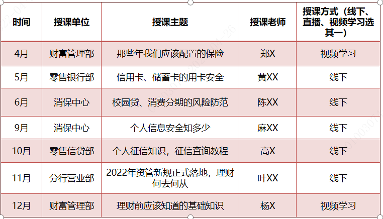 为落实将金融教育纳入国民教育体系工作,招商银行温州分行计划按月在星空平台商学院开展月度金融讲堂。通过广泛征集系统内金融教育课件,制定《招商银行温州分行月度金融讲堂授课表》,明确全年授课主题、授课老师及授课方式。授课主题包括理财、基金、黄金、保险、外汇、个人贷款、银行卡(信用卡)使用、防范电信诈骗等内容,授课方式包括班级(金融宣讲团)现场授课、网络直播、视频学习等方式。