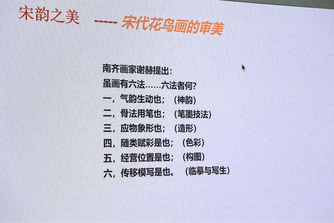 这次讲座,谢子静教授主要围绕“气韵生动之美”和“意境之美”两个内容进行解读,通过宋代的人物、山水画作品了解宋代的经济、文化和美学思想;通过对《果熟来禽图》《杨柳乳雀图》《出水芙蓉图》《疏荷沙鸟》等经典宋画作品作为案例来赏析,带观众感受这些画中藏着的“气韵生动之美”和“意境之美”。“气韵生动”是中国绘画创作的最高原则,是中国画艺术精神的集中体现,也是判断绘画的审美境界的价值标准。而“意境之美”是中国传统美学思想的重要范畴,在传统绘画中是作品通过时空境象的描绘在情与景高度融会后所体现出来的艺术境界。