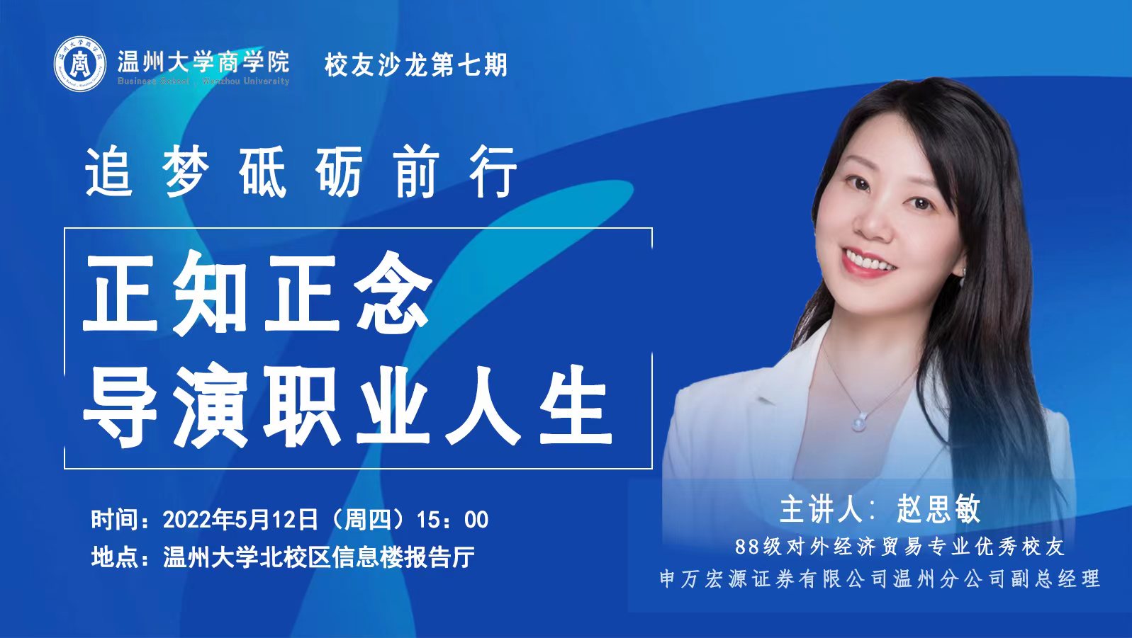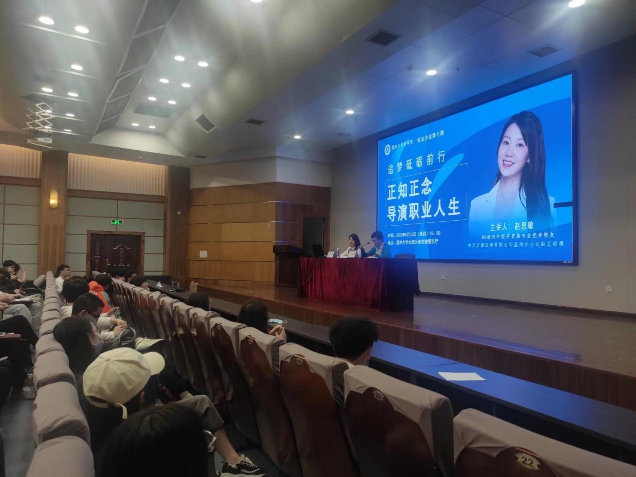 “玉经琢磨多成器,剑拔沉埋便倚天”。为了感受校园和职场的差别,为在校生的未来职场道路提供不一样的思考和建议,本次讲学特别邀请到了申万宏源有限公司温州分公司副总经理赵思敏学姐(88级对外经济贸易专业优秀校友),为现场本科生带来了别开生面的一节职业规划生涯课。她于1990年开始入职银行会计员工作,从一线员工一路晋升到总经理,全面主持公司、零售、运营等工作,拥有超过30年的金融行业工作经历,具有丰富的银行从业经验、突出的工作业绩和出色的战略规划能力。