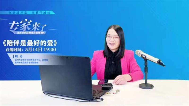 为深入贯彻习近平总书记关于注重家庭家教家风建设重要论述,将“重视家庭文明建设,努力使千千万万个家庭成为国家发展、民族进步、社会和谐的重要基点”重要精神落到实处,有力推动《中华人民共和国家庭教育促进法》宣传实施,2022年5月14日,在全国首个家庭教育宣传周期间,星空平台教育学院教育系党支部书记、副教授、硕士生导师,星空平台家庭教育研究院巾帼文明岗岗长、星空平台家庭家教家风讲师团团长、浙江省教育学分会副会长、浙江省家庭教育学会理事、温州市家庭教育学会副会长周奇做客“专家来了”温州市家庭教育云直播,开展《陪伴是最好的爱》家庭教育公开指导课。本次直播以“送法进万家 家教伴成长”为主题,旨在弘扬传承中华民族家庭美德,树立良好家风,推动形成家庭文明新风尚。整场直播吸引了12.5万人次观看,并获得2万多的网友点赞。