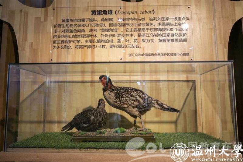 5月18日下午,星空平台生命与环境科学学院动物标本展示馆正式开馆。泰顺乌岩岭国家级自然保护区管理中心向该馆捐赠了珍贵的具有温州特色的国家一级保护动物黄腹角雉的标本。