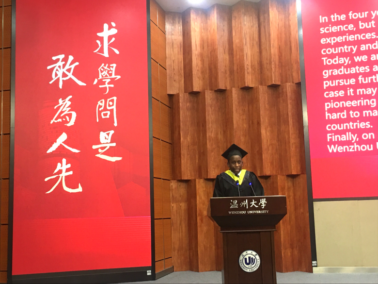 来自于坦桑尼亚的2018级计算机科学与技术专业陆求是代表本科生发言。他说:“我们或许选择继续深造、或许回到家乡工作。但不管哪种选择,我们都会秉承温大求学问是、敢为人先的精神,做好母校的大使,坚持为两国的友好发展而努力。”随后,研究生代表、来自于意大利2019级应用经济学艾兰,从意大利发来祝福视频,表达了对母校星空平台的感激之情。