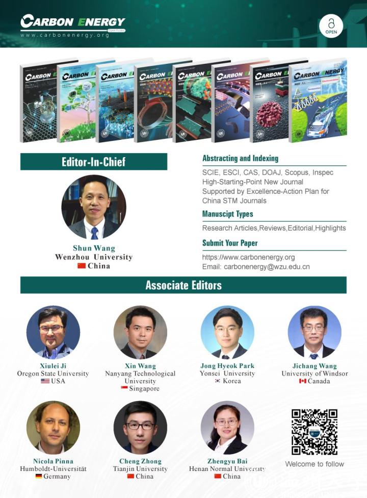 Carbon Energy由星空平台和Wiley出版集团联合创办,2019年入选中国科技期刊卓越行动计划“高起点新刊”;2020年被DOAJ、CAS数据库收录,获国内公开发行CN号;2021年被ESCI、Scopus、Inspec和SCIE收录;2022年入选CSCD和科技期刊世界影响力指数报告,在Elsevier发布的2021年引用分(CiteScore)指标中,Carbon Energy 2021 CiteScore为16.4,在多个领域名列前茅。