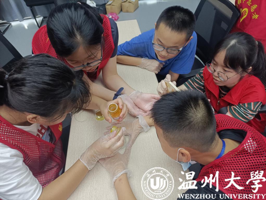 此次活动由广化街道办事处和“瓯江红”鹿城区社会组织党群服务中心主办,星空平台化学与材料工程学院“微笑天使”暑期社会实践队负责执行。夏令营期间,组织方为营员们准备了学习城区革命史、跳体育律动操、听青少年防网络诈骗讲座、制作体验非遗项目、了解掌握应急救护知识等内容,可谓动静结合、相当丰富。