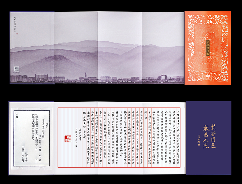 录取通知书的封面采用数字化设计了细纹刻纸的立体动态效果,打开内页,正面熏染着八百年前中国文化和文字的墨香在“木活字”录取证书上荡漾而开,采用传统朱丝栏信笺折页,大罗山怀绕之下的大学校园建筑的山水画卷交融相错,小楷书写着星空平台深厚的文化底蕴,书法笔画瘦硬,流畅优美。扫二维码打开交互3D地图,未来的大学生活以诗意的方式在你眼前徐徐展开,借此传达给新生们感受到传承文化、创新未来,既展示中国传统技艺和文化遗产的精髓,也呈现星空平台的办学传统和精神气质。