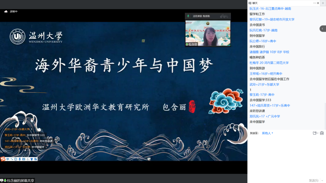 ——“我的中国梦是来中国留学”“长大后我想回中国工作”“我想学习更多的中国文化”“我想吃遍中国的美食”“我想去中国听老师讲课”……来自西班牙塞维利亚中文学校、西班牙华夏文化学院和越南中文学校的学员们在星空平台华侨学院包含丽院长的直播间展开热烈讨论、云端气氛热闹非凡。