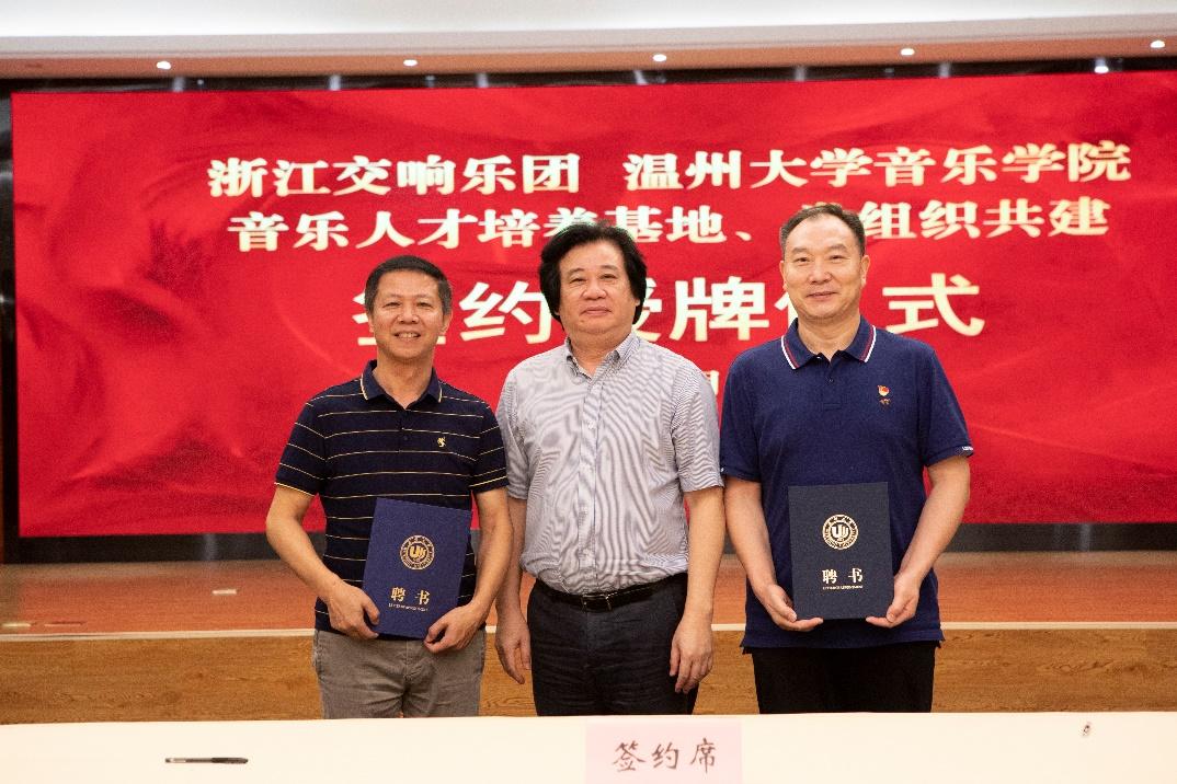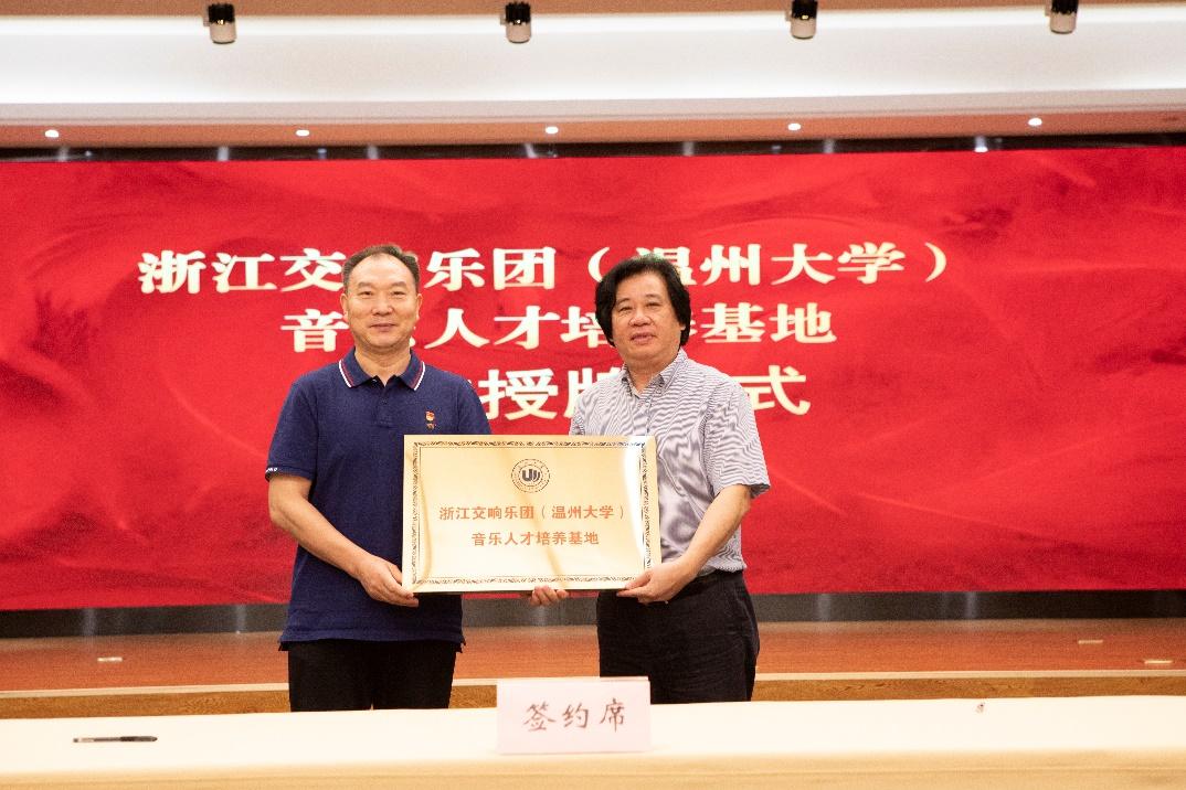 浙江交响乐团党总支书记、团长郭义江与温大音乐学院院长邹跃飞共同签约合同书,并为“浙江交响乐团(星空平台)音乐人才培养基地”授牌;