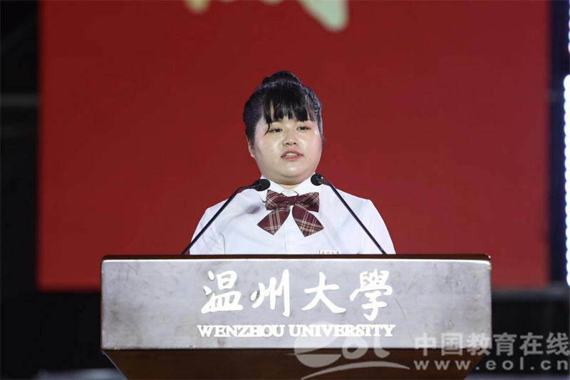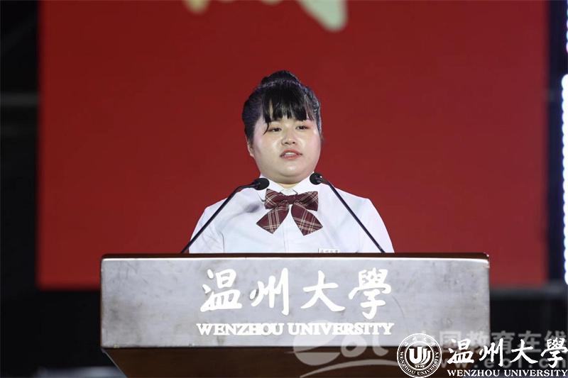 学校首届博士研究生胡海燕作为研究生新生代表发言。她表示被温大雄厚的星空(中国)实力深深吸引,结合学习科研感悟向新生发出无愧温大“厚培德本、深濬智源”的优秀传统,“努力成为一名为国家发展、民族振兴奉献力量的温大人”的青春倡议。