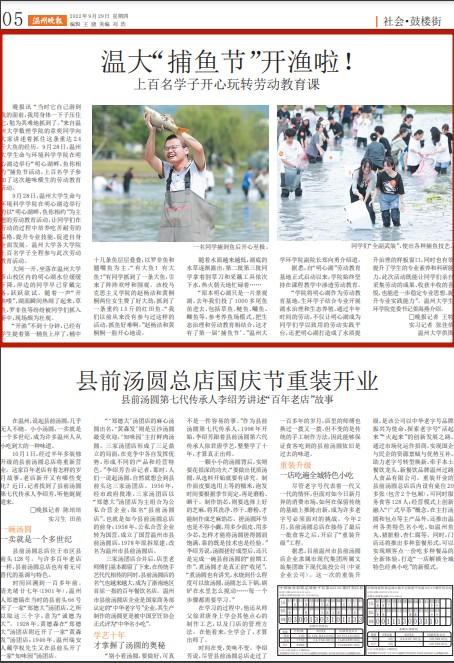 “当时它自己游到 我的面前,我用身体一下子压住 它,勉为其难地抓到了。”来自温 州大学数理学院的章奕同学向 大家讲述着抓住这条重达 2.4 斤大鱼的经历。9月28日,温州 大学生命与环境科学学院在明 心湖边举行“明心湖畔,鱼你相 约”捕鱼节活动,上百名学子参 加了这次趣味横生的劳动教育 活动。