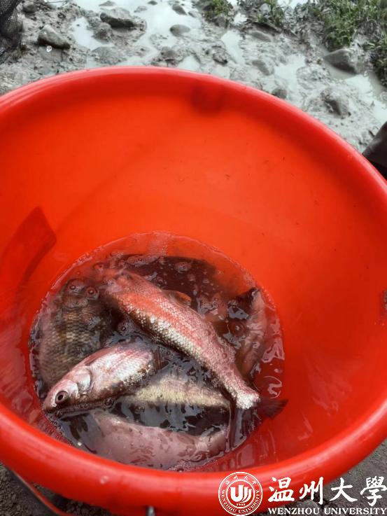 “开渔”未过十分钟,已经有学生提着第一桶鱼上岸了。“有大鱼!有大鱼!”突然,又有同学抓到大鱼,引来了阵阵欢呼和围观。原来是来自该校马克思主义学院的两位女生,赵杨洁和黄桐桐共同努力抓到了她们的第一条鱼,一条重量约1.5斤的红鲤鱼。
