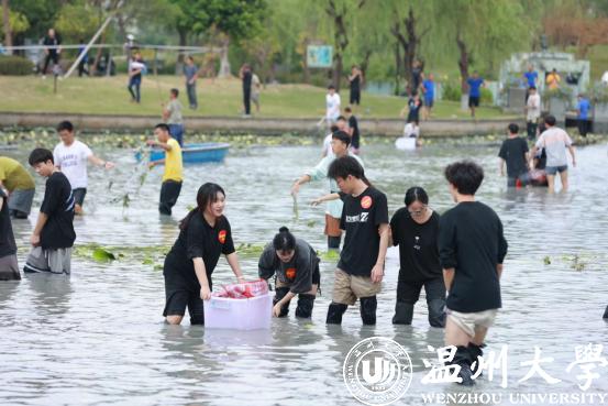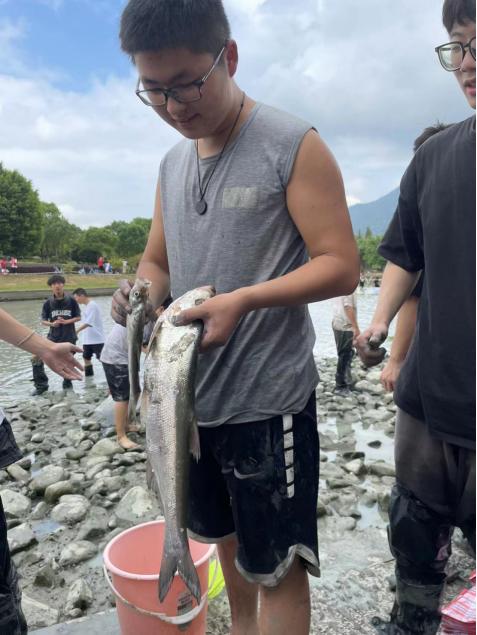 水闸一开,明心湖水缓缓下降,岸边的同学早已穿戴完备,跃跃欲试。随着一声“开渔咯”,湖面瞬间热闹了起来,草鱼、鲤鱼等纷纷被同学们抓入篓中,岸边的师生也举起手机,记录下这壮观的一幕。