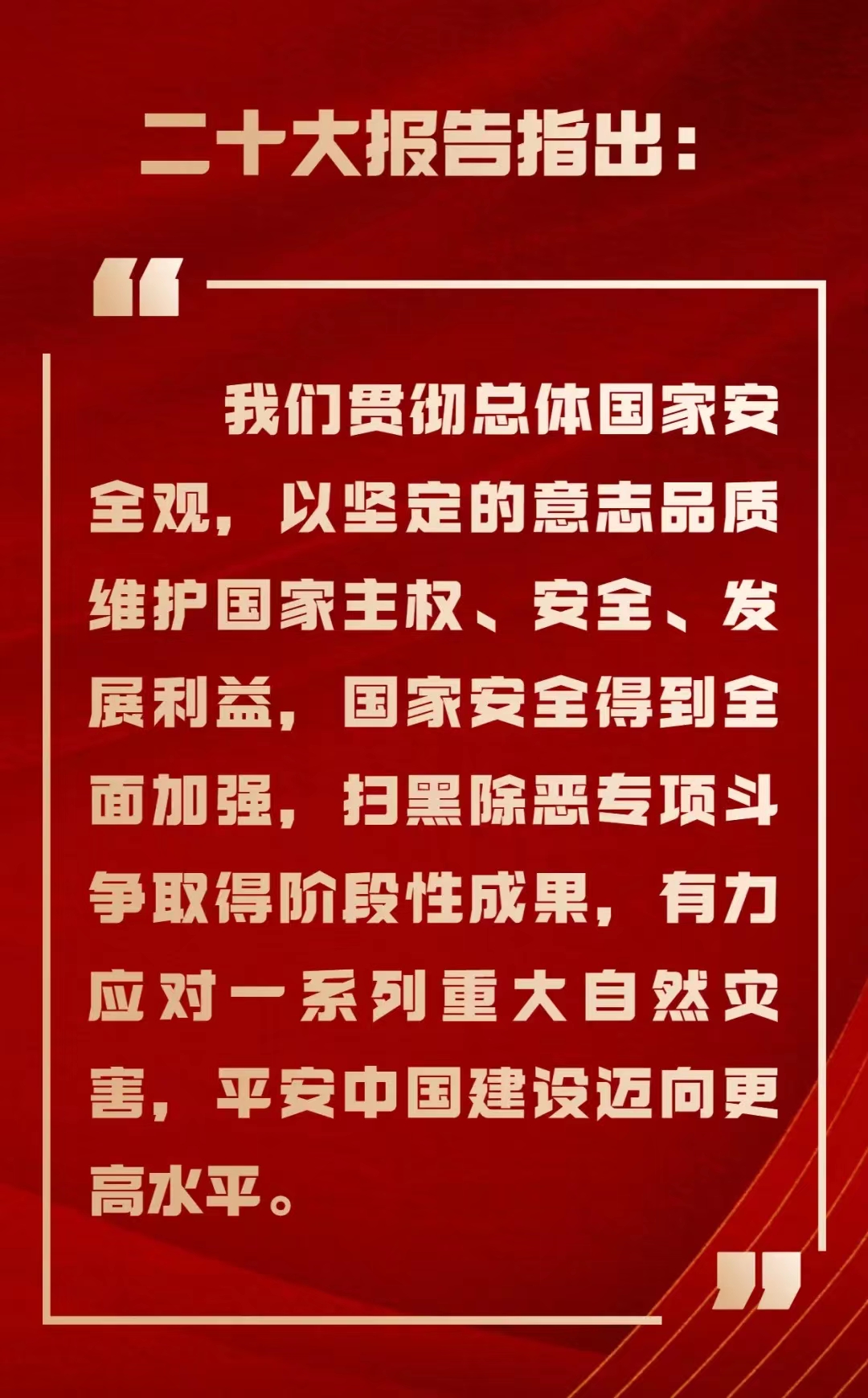 习近平总书记在党的二十大报告中提出要坚持以人民安全为宗旨,这是我们政法部门必须牢记的神圣使命。过去十年,我们的共建共治共享社会治理制度进一步健全,扫黑除恶专项斗争取得了阶段性成果。社会治安明显好转,人民群众的安全感更高了。在这个基础上,我们更要进一步坚定不移地贯彻总体国家安全观,推进国家安全体系和能力现代化,坚决维护国家安全和社会稳定。畅通和规范群众诉求表达、利益协调、权益保障通道,依法严惩群众反映强烈的各类违法犯罪活动。司法机关更要加快建设公正高效权威的社会主义司法制度,努力让人民群众在每一起司法案件中感受到公平正义。