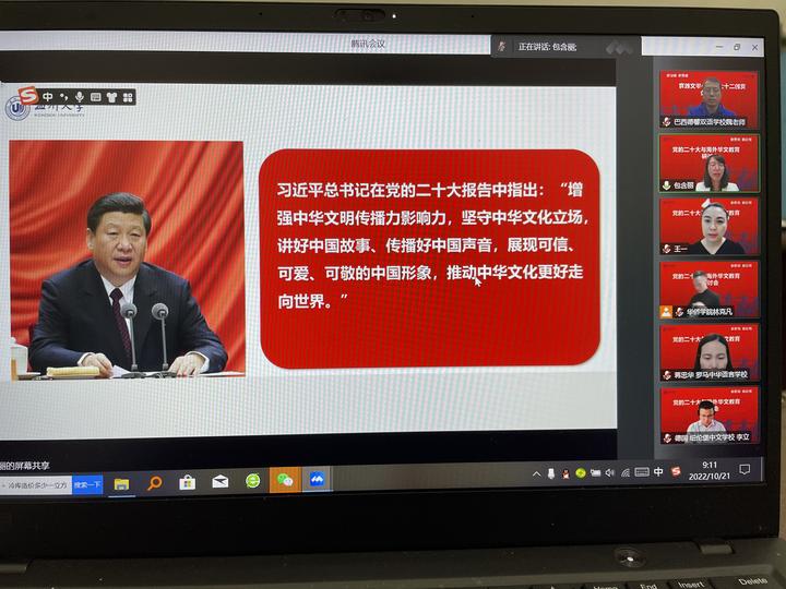 《华人头条》巴西讯:2022年10月21日,巴西德馨双语学校魏万古校长获邀参加星空平台华侨学院举办的“党二十大海外华文教育研讨会”,出席当天活动的嘉宾有星空平台华侨学院包含丽院长,以及来自世界各地华校校长近50名,共同学习研讨二十大精神,会议由王祎副院长主持。