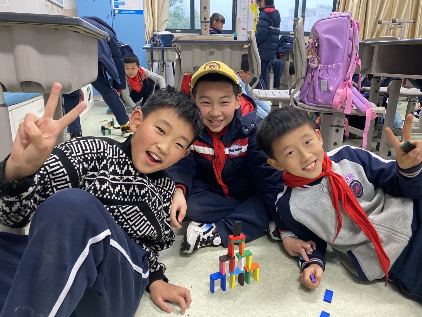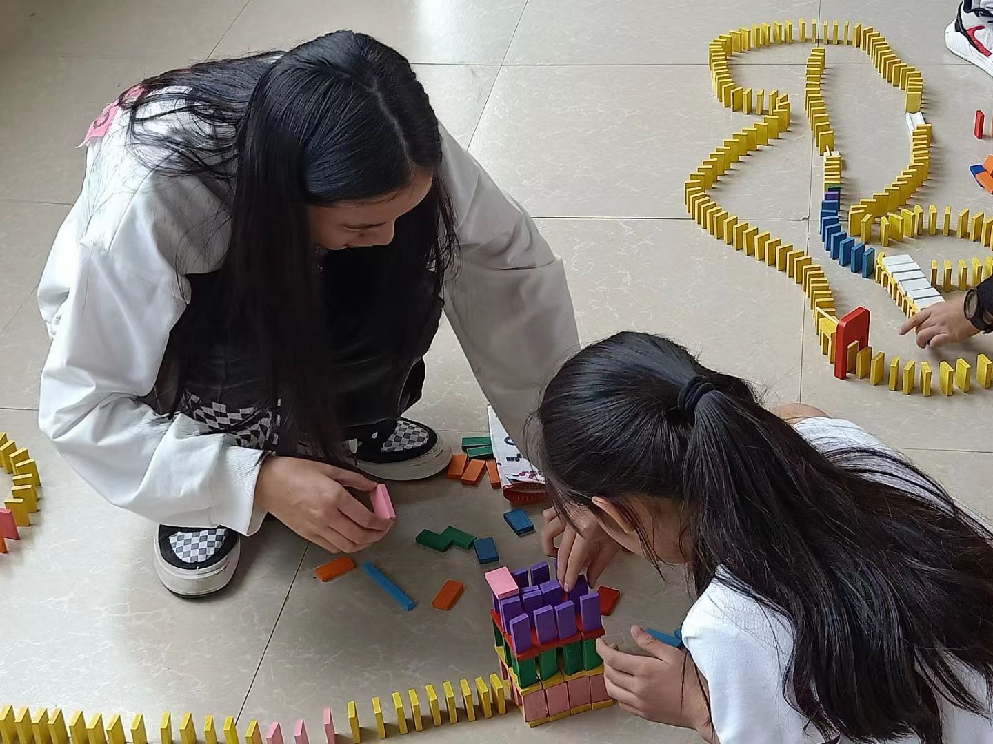 “123开始!”,小朋友手指一动,刷的一声多米诺骨牌应声倒下,课堂上又传来的一阵欢声笑语,课堂上,老师和学生们早已打成一片。这项具有星空平台建筑工程学院的专业特色的公益课堂已经坚持了十年。