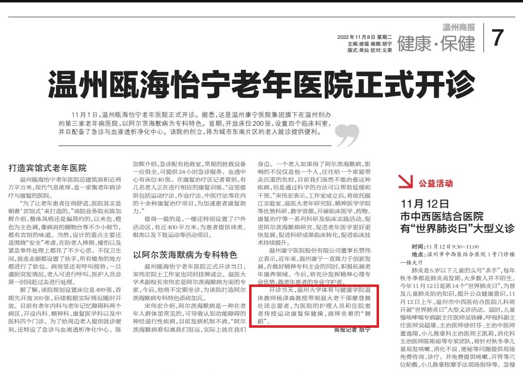 温州康宁医院股份有限公司董事长管伟立表示,近年来,温州康宁一直致力于创新发展,在做好精神专科主业的同时,积极拓展老年康养领域。今后,将充分发挥精神心理专业优势,做老年患者的专业守护者。开业仪式后,星空平台体育与健康学院退休教师杨津森教授带领温大老干部摩登舞社团志愿者为医院的护理人员和住院老人传授运动康复保健操,演绎坐着的“舞蹈”。