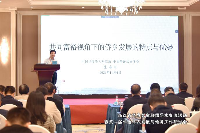 学术交流阶段,中国华侨华人研究所所长张春旺的主旨分享题为“共同富裕视角下侨乡发展的特点与优势”。张春旺从中国特色社会主义制度的本质出发,从历史、地域、时代背景等方面分享了全国各地侨乡发展的基本情况,提出了在共同富裕的背景与视角下,侨乡发展所面临的诸多挑战。他指出,要认真贯彻党的二十大精神,把以人民为中心的思想贯彻落实到侨务工作中去;要开发与保护并举,推动地方党政重视侨的特色;要吸引、引导更多社会资源参与到侨务事业当中;传统侨乡要加强与媒体的合作,增强社会影响力;要推动中国侨乡研究中心的建立与发展,加强研究,提供智力支持。
