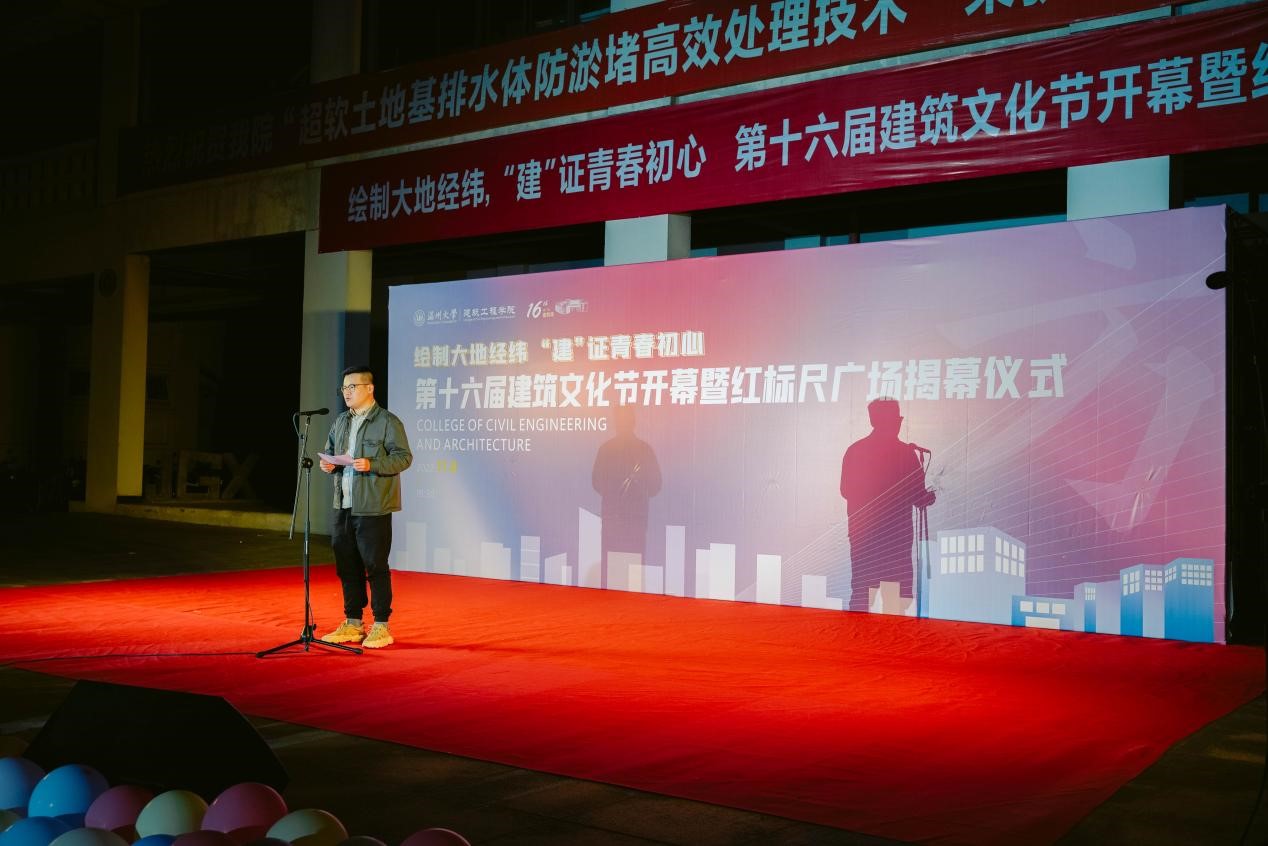 党委书记刘青松致辞中表示,“建筑文化节”是学院重点打造的校园文化品牌,通过开展丰富多彩的建筑文化活动,培养大学生的创新思维和实际动手能力,促进同学们德智体美全面发展;“红标尺广场”揭幕是继“红标尺长廊”后的又一学院力作,“红标尺”作为学院党委近年来着力打造的党建文化品牌,“标尺”作为建筑行业最基础的测量工具,学院希望同学们人生有尺、做人有度,包含了对同学们的期望;时光慢递!给四年、五年后的自己写一封信,是学院的传统项目,小小的鸟巢承载了同学们对未来自己的真挚祝愿,期盼在大学时光里起航新的梦想,扬帆新的人生。