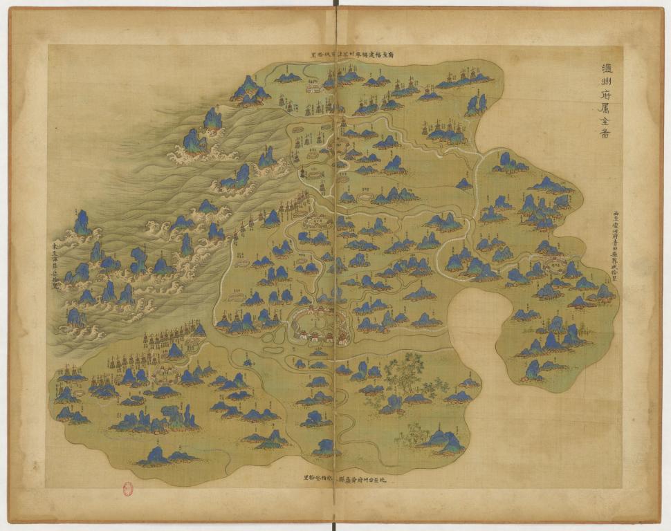 近日,在浏览一微信公众号时,陈斌的发现一套图注绘于1661至1686年之间,来自法国国家图书馆藏,作者不详的《浙江全图》,内容为清代浙江省各州县地图,共含青绿山水地图八十八幅。细细查阅温州府地图,他发现温州城池西边、瓯江沿岸有座没听过的山,紧邻太平山。因为玩航拍而对温州地理风貌了熟于心的陈斌,一下子就被这个名叫“回鹘”的山,吸引了视线。“众所周知,回鹘是中国西域的少数民族部落。”陈斌好奇为何古温州会有这样一座带有鲜明少数民族特色名字的山。